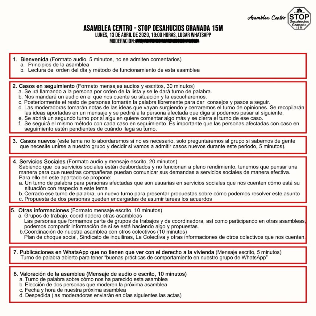The weekly assembly is attended by 20-50 people. Every week a different person chairs the session. First, our principles and values are restated and the agenda is agreed. Secondly, affected families and the members of Stop Evictions Granada 15M who have agreed to support them, update and discuss their cases. Third, new cases are presented. Fourth, information is shared from other assemblies (in our province there are 11 assemblies) and their working groups, including information about wider proposals for actions, etc.